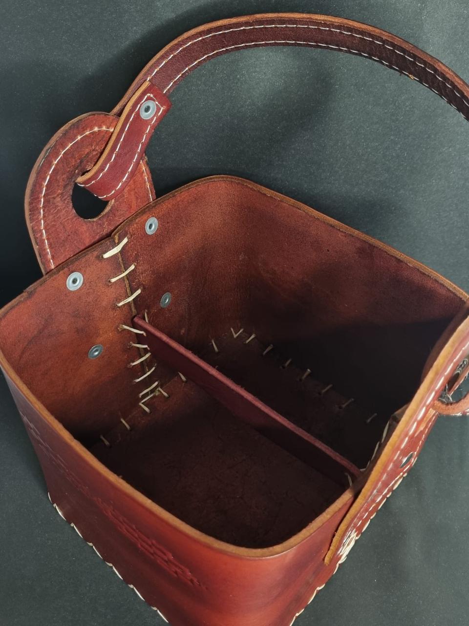 Matera premium 100% cuero con costuras blancas reforzadas, elegante, resistente y práctica para llevar todo tu equipo matero con estilo.